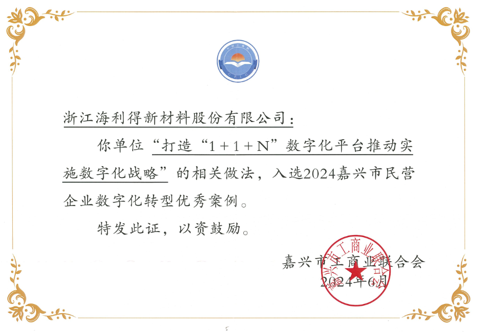 近日,嘉興市工商業(yè)聯(lián)合會舉辦了“科創(chuàng)未來·數(shù)智賦能”政銀企懇談會,會上發(fā)布了2024年嘉興民營企業(yè)“數(shù)轉(zhuǎn)智改”典型案例,公司《打造“1+1+N”數(shù)字化平臺推動(dòng)實(shí)施數(shù)字化戰(zhàn)略》榜上有名。