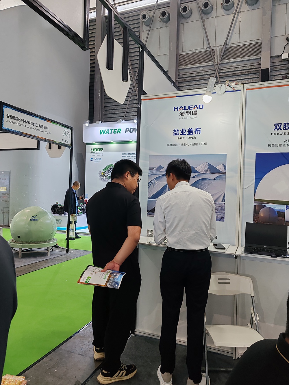 近日,第26屆中國環(huán)博會在上海新國際博覽中心舉辦。本次展會,海利得向客戶展示并推廣了第三代環(huán)境材料與產品,包括沼氣柜內膜、外膜、污水池蓋頂和圍欄等。此外,本次展會還特別推出一款新產品——鹽業(yè)蓋布,該產品已通過第三方EN71-3檢測以及鹽霧測試,主要用于鹽業(yè)廠蓋布,是一款新型環(huán)保材料。